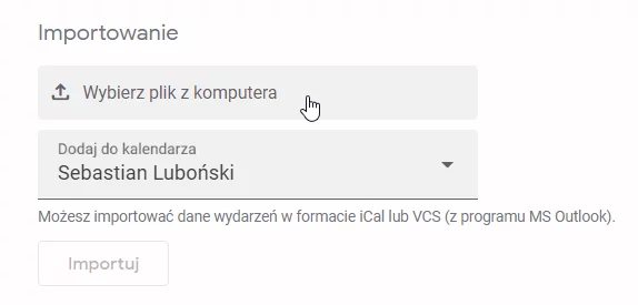 - na samym dole po lewej stronie, przy Inne kalendarze, kliknij w plusik, a później wybierz opcję Importuj,